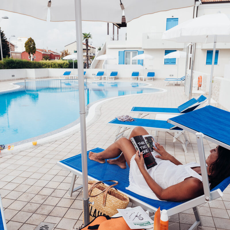 Villaggio moderno con 12 alloggi, piscina con vasca bimbi, garage e bargilda Jesolo. Nel centro di Jesolo Lido, con vista sulla scritta ‘JESOLO’ e su Piazza Drago. A circa 300 m dal mare. Posto spiaggia presso MARCONI BEACH.